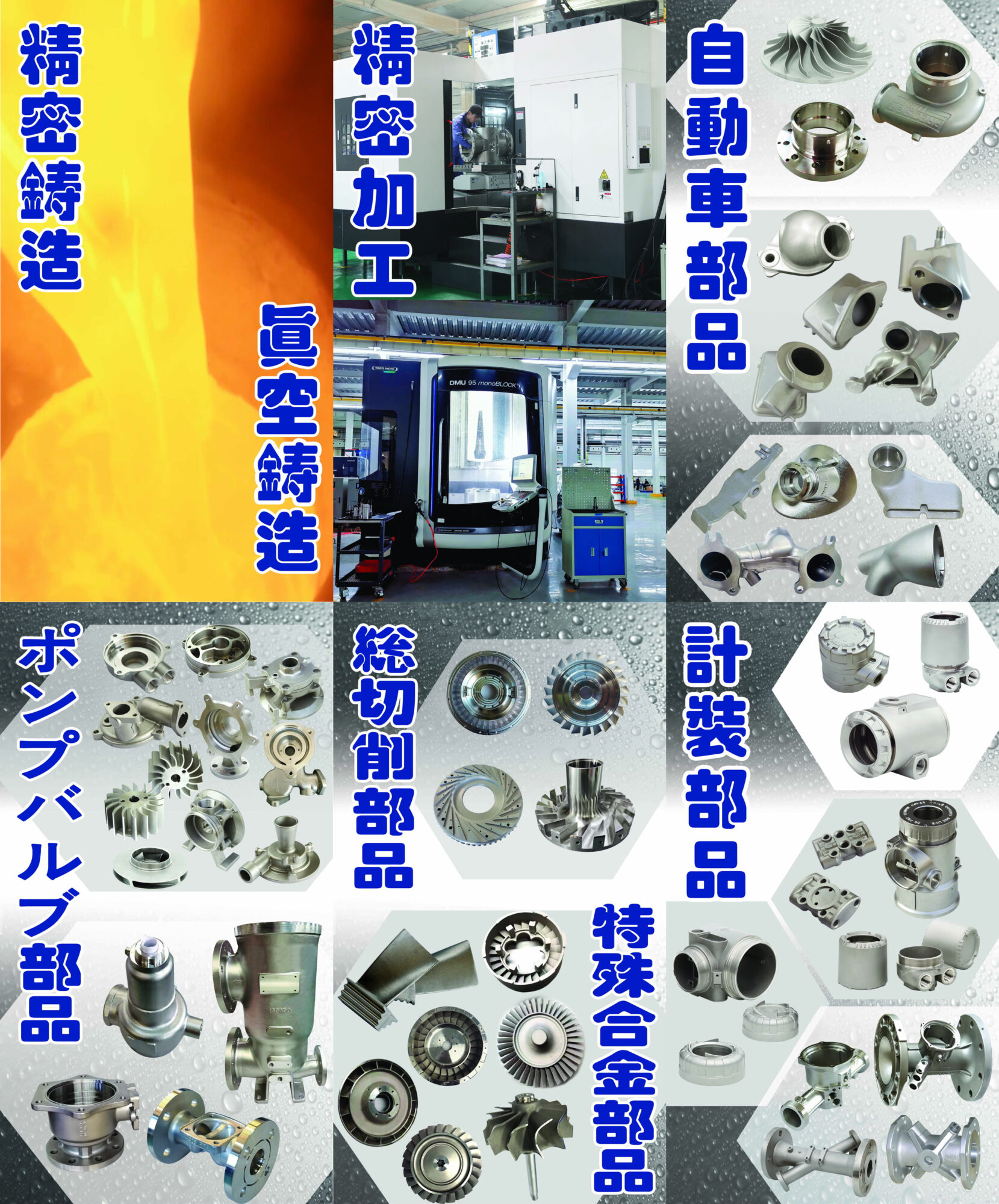 ロストワックス精密鋳造 ロストワックスは、ロウを使った精密な鋳造法で、さまざまな金属材料に対応可能。複雑で精密な部品を手頃な価格で製造でき、強度や精度が求められる部品にも対応できるため、幅広い業界で利用されています。 金型は比較的安価で、長寿命(半永久的)です。設計変更時には金型の修正が可能で、抜き勾配も必要ありません。 複雑な形状や三次元的な形状に対応でき、複数の部品を一体化したり、アンダーカット形状にも対応できます。 ステンレス、鋼、特殊鋼などの金属材料に対応しており、難削材にも得意です。 少量(5個~)から中量(数十個~数百個)の生産に強みを持ち、それ以上の大規模な生産にも対応可能です。 一般的な鋳物に比べて寸法精度が高く、鋳肌が美しく、金属組織も緻密です。高精度や美観、強度が求められる部品にも最適です。 鋳物の金属加工も得意でお客様のニーズに合わせてミクロン単位まで精密機械加工可能です。 WORLD JOINT 株式会社では、計装部品、自動車部品、ポンプバルブ部品、総切削部品、特殊合金部品等の精密鋳造、真空鋳造、精密加工を承っております。